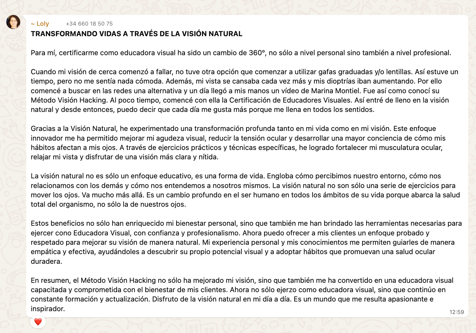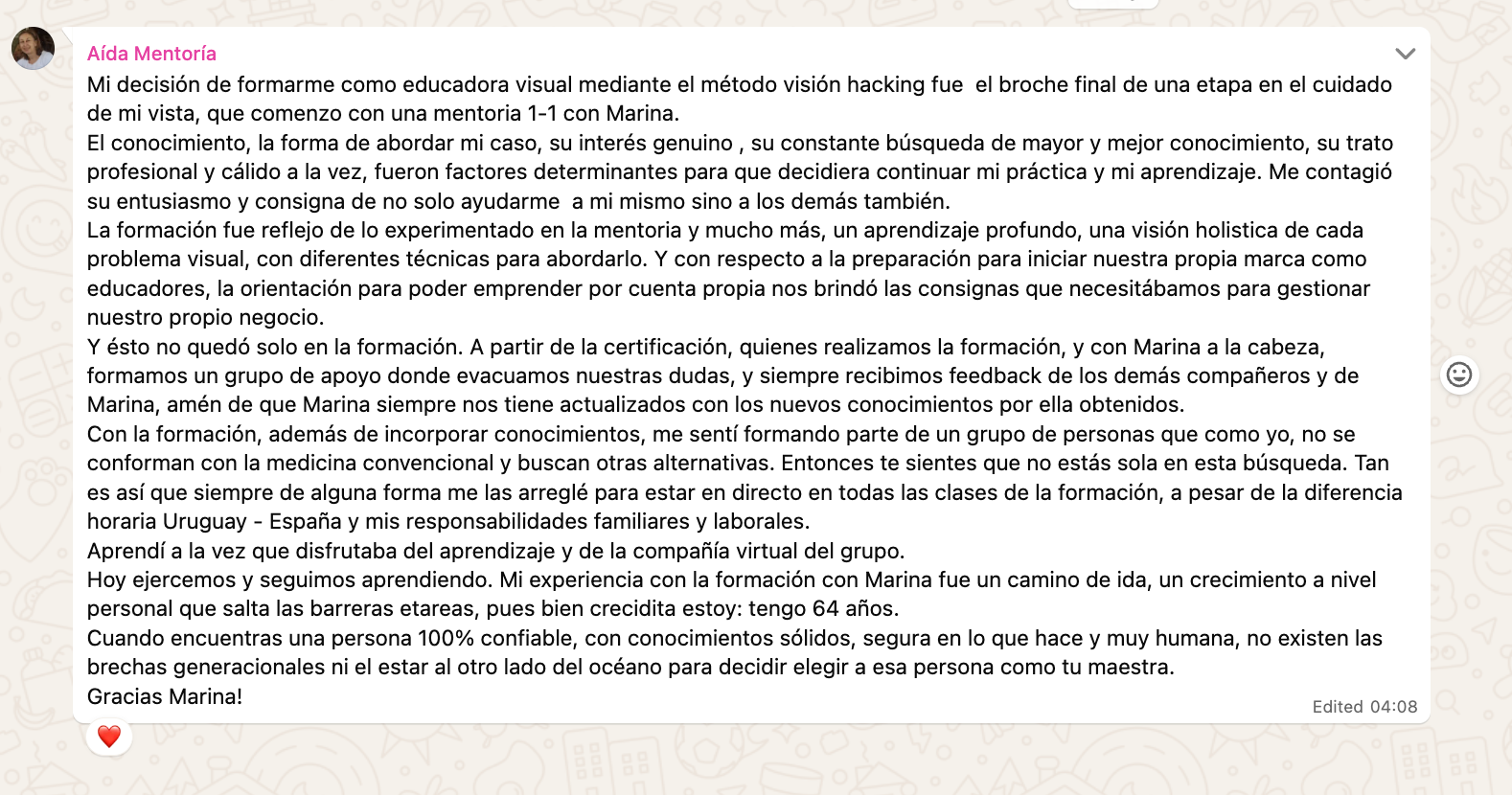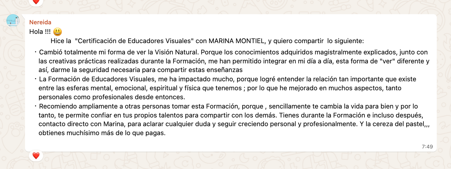 Formo a educadores visuales en mi método propio Visión-Hacking para que tengan un paso a paso y seguridad a la hora de ayudar a sus clientes, todo acompañado desde visión de negocio para que sean profesionales expertos de la visión natural.