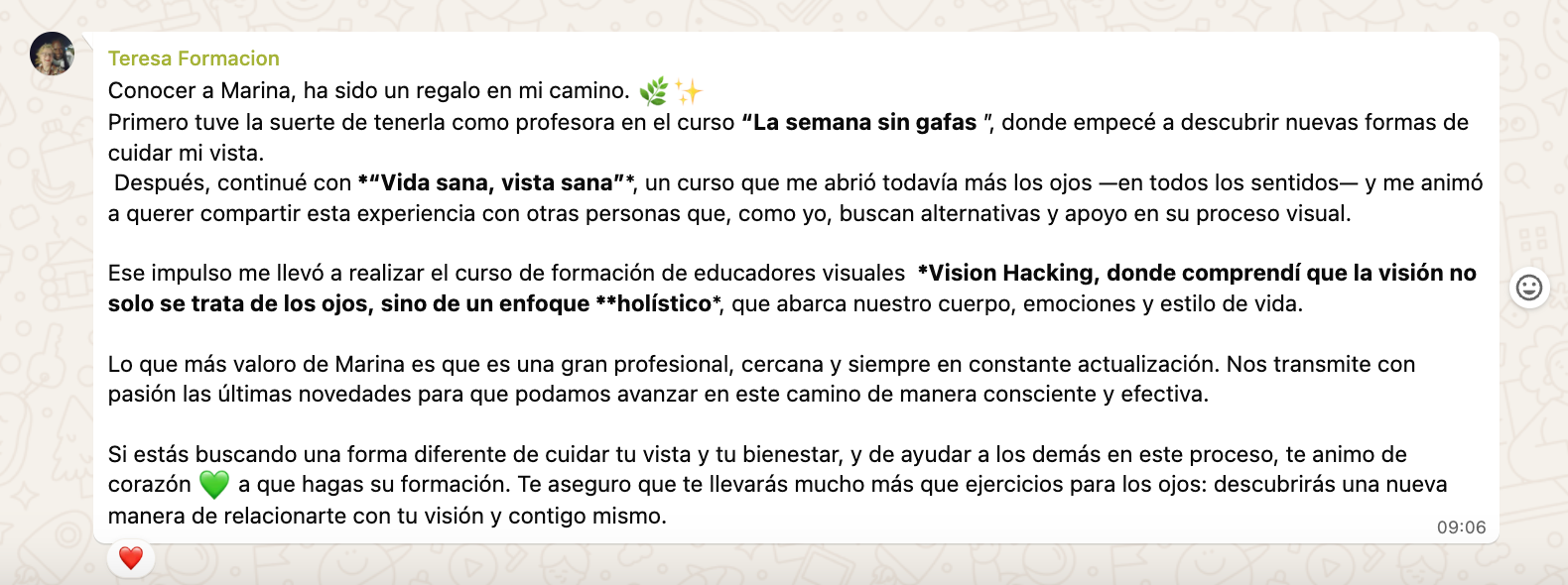 Es un camino integral donde reeducas tu sistema visual desde la mente, el cuerpo, el sistema nervioso y la función visual… y aprendes a acompañar procesos reales con estructura.