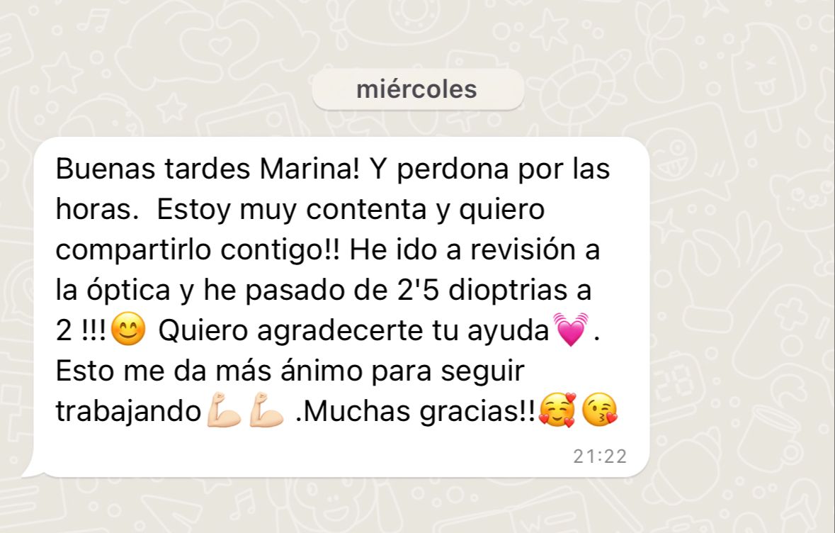 Llevo desde 2015 ayudando a personas a mejorar la visión de manera natural para que puedan prescindir del uso de gafas y lentillas.